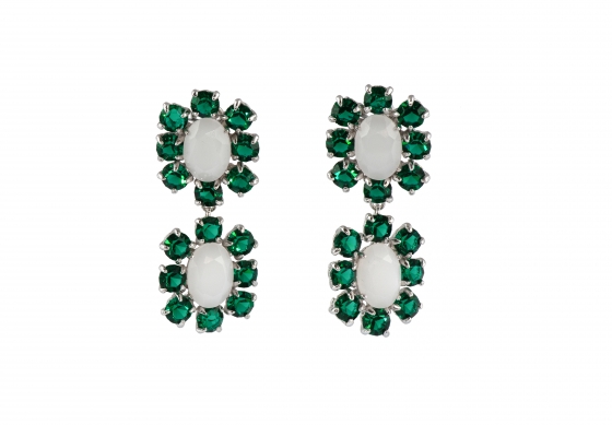 Modello doppio ovale- con perno e clip, mono o bi/color Materiale: Argento 925 Anallergico Galvanica: Rodio Colore pietre: Bianco latte e verde smeraldo